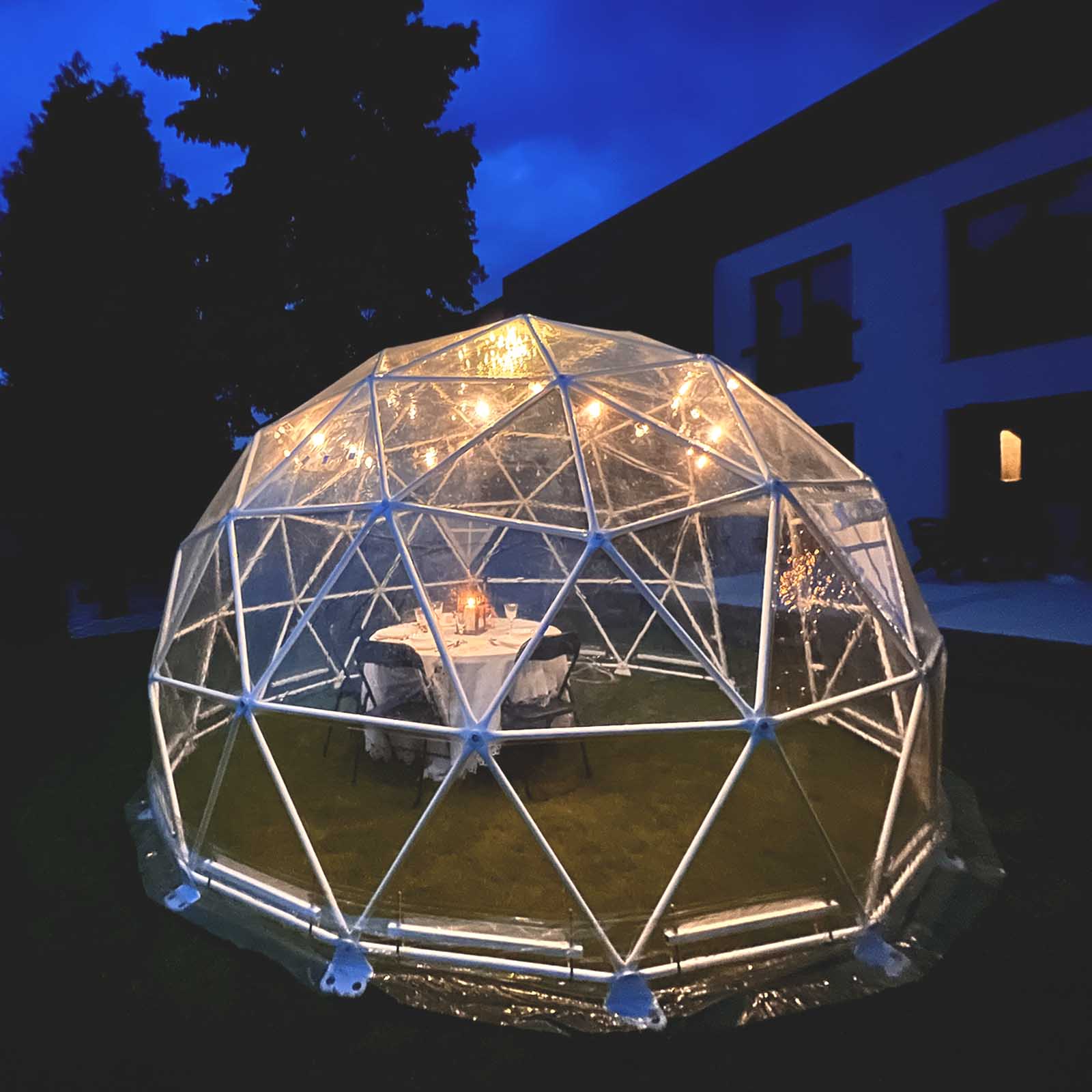 Pateicoties lielajam ārējā apvalka pamatsvaram un iekšējam izolācijas slānim, mūsu kupolveida teltis var izmantot visu gadu. Turklāt telts ir aprīkota ar ventilācijas atverēm un saules ventilatoru. Ir iespējams arī uzstādīt gaisa kondicionieri.