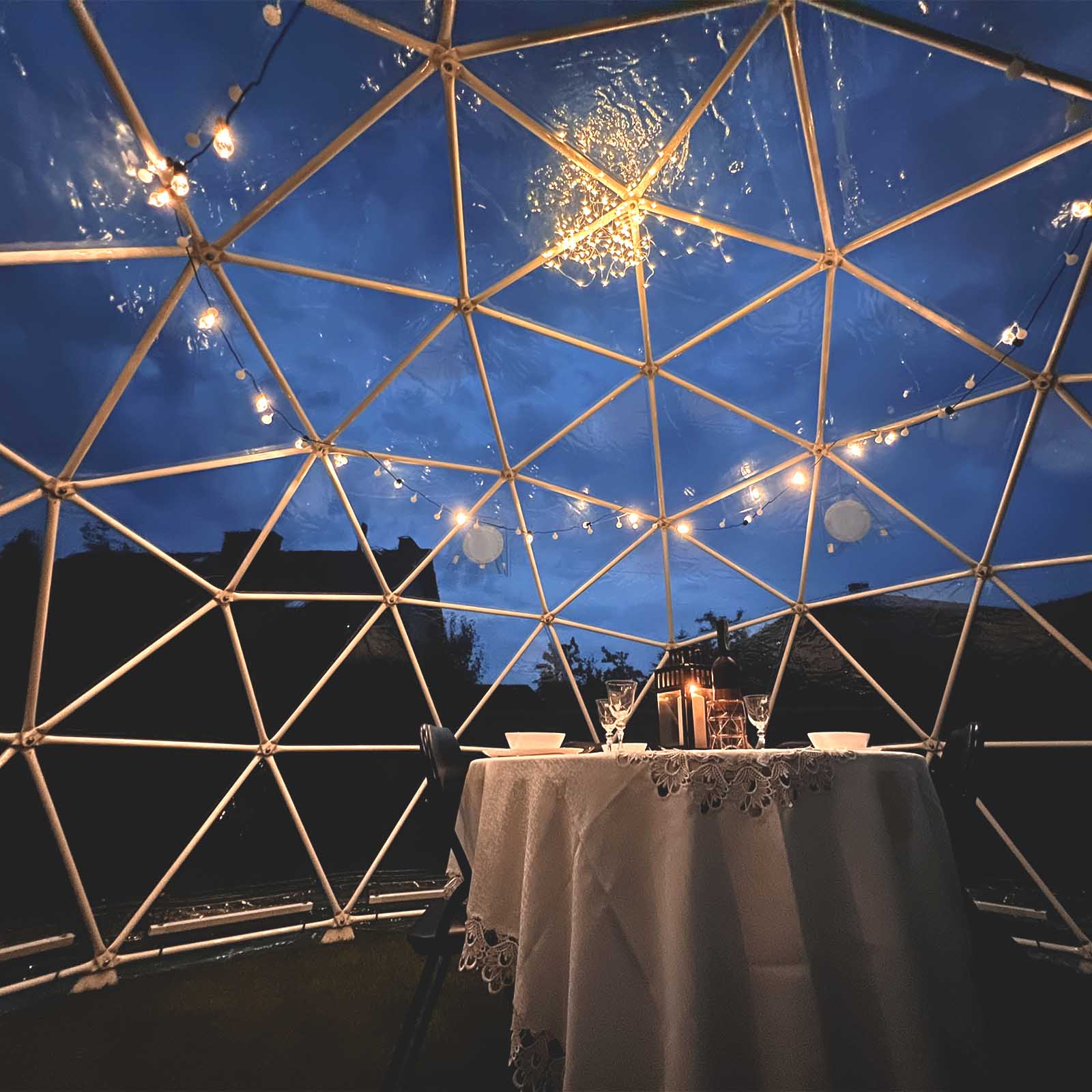 Sfēriskā telts jeb glempings būs lieliski piemērots un noderīgs jebkurai lauku sētai vai pludmalei vai pat pilsētas kvartālos. Kupols ir skaists un daudzfuncionāls.